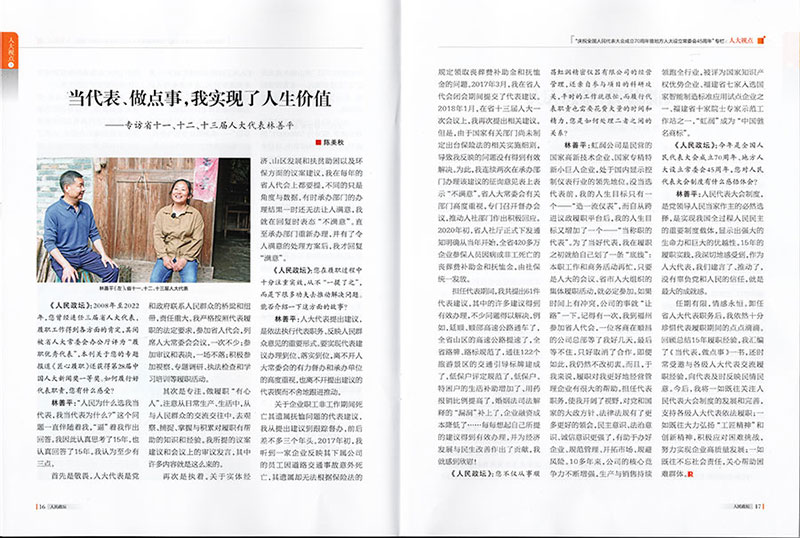 林善平:虹潤公司是民營的國家高新技術(shù)企業(yè)、國家專精特新小巨人企業(yè),處于國內(nèi)顯示控制儀表行業(yè)的領(lǐng)先地位。沒當(dāng)選代表前,我的人生目標(biāo)只有一個(gè)——“造一流儀表”,而自從跨進(jìn)議政履職平臺后,我的人生目標(biāo)又增加了一個(gè)——“當(dāng)稱職的代表”。為了當(dāng)好代表,我在履職之初就給自己劃了一條“底線”:本職工作和商務(wù)活動(dòng)再忙,只要是人大的會(huì)議、省市人大組織的集體履職活動(dòng),就必定參加。如果時(shí)間上有沖突,公司的事就“讓路”一下。記得有一次,我到福州參加省人代會(huì),一位客商在順昌的公司總部等了我好幾天,最后等不住,只好取消了合作。即便如此,我仍然不改初衷。而且,于我來說,履職對我更好地經(jīng)營管理企業(yè)有很大的幫助。擔(dān)任代表職務(wù),使我開闊了視野,對黨和國家的大政方針政策、法律法規(guī)有了更多更好的領(lǐng)會(huì),民主意識、法治意識、誠信意識更強(qiáng)了,有助于辦好企業(yè)、規(guī)范管理、開拓市場、規(guī)避風(fēng)險(xiǎn)。10多年來,公司的核心競爭力不斷增強(qiáng),生產(chǎn)與銷售持續(xù)領(lǐng)跑全行業(yè),被評為國家知識產(chǎn)權(quán)優(yōu)勢企業(yè)、福建省七家入選國家智能制造標(biāo)準(zhǔn)應(yīng)用試點(diǎn)企業(yè)之一、福建省十家院士專家示范工作站之一,“虹潤”成為“中國馳名商標(biāo)”。