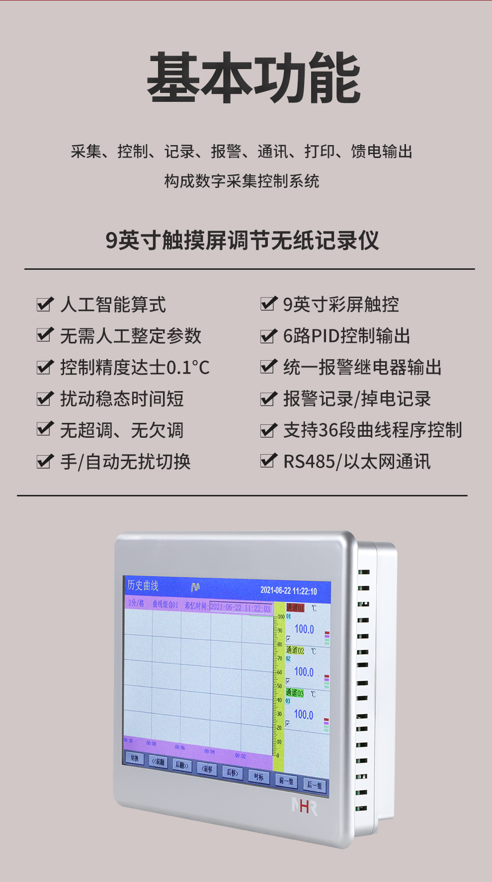 虹潤(rùn)公司是專業(yè)生產(chǎn)無(wú)紙記錄儀的國(guó)家專精特新“小巨人”企業(yè)。生產(chǎn)的觸摸屏調(diào)節(jié)無(wú)紙記錄儀,具有觸摸大屏顯示,真正人工智能算式,無(wú)需人工整定參數(shù),控制精度達(dá)士0.1°C,數(shù)據(jù)記錄與轉(zhuǎn)存, RS485/以太網(wǎng)通訊,5/7/9英寸可選等特點(diǎn)。產(chǎn)品獲得智能化控制器、人工智能調(diào)節(jié)器及調(diào)節(jié)方法、模糊PID控制儀及控制方法、平板無(wú)紙記錄儀、巡回檢測(cè)顯示方法及裝置等5項(xiàng)國(guó)家發(fā)明專利,主持起草物聯(lián)網(wǎng)智能記錄儀表通用技術(shù)條件、物聯(lián)網(wǎng)智能溫度儀表通用技術(shù)條件、工業(yè)過(guò)程測(cè)量和控制系統(tǒng)用智能調(diào)節(jié)器等3項(xiàng)國(guó)家標(biāo)準(zhǔn),通信系統(tǒng)多通道數(shù)據(jù)采集控制終端規(guī)范軍用標(biāo)準(zhǔn),以及空間數(shù)據(jù)與信息數(shù)據(jù)傳輸系統(tǒng)等2項(xiàng)航天標(biāo)準(zhǔn),參與國(guó)際5G標(biāo)準(zhǔn)制定,取得觸摸屏彩色調(diào)節(jié)無(wú)紙記錄儀等3項(xiàng)相關(guān)軟件著作權(quán)。產(chǎn)品廣泛應(yīng)用于電力、石化、冶金、化工、食品、制藥、熱處理、水處理、機(jī)械配套等諸多領(lǐng)域。
